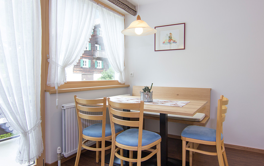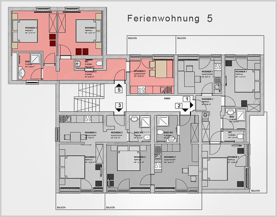 Diese Ferienwohnung verfügt über zwei Doppelzimmer, einem Badezimmer mit Dusche, einem WC, einer Küche mit Esstisch und einem Nordbalkon.